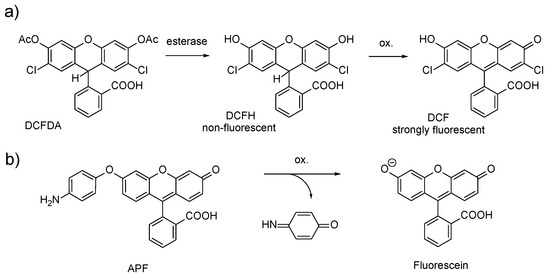 Mode of action of commonly used Reactive Oxygen Species (ROS) probes: (a) DCFH, (b) APF. 2,7-dichlorodihydrofluorescein (DCFH), and 2-[6-(4′-amino)phenoxy-3H-xanthen-3-on-9-yl] benzoic acid (APF).