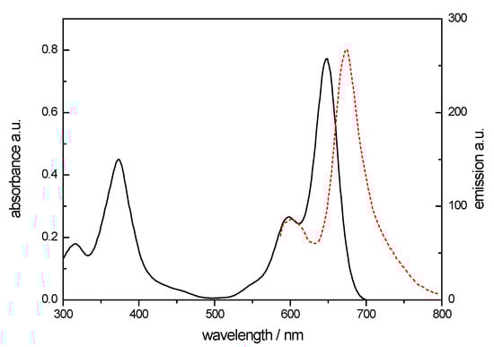 Figure 4 shows the absorption and emission spectra of NB-2 in methanol at 23 °C. The compound had its absorption maximum at λ = 647–653 nm (molar absorptivity has been calculated as ε649nm = 5.1 × 104 M−1·cm−1) with a shoulder band with a local maximum at 596 nm, and strong absorption at 373 nm (ε373nm = 3.0 × 104 M−1·cm−1).