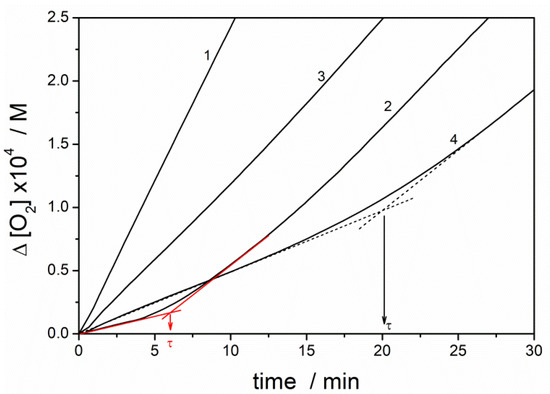 where ∆[O2]t stands for molar oxygen consumption [M] recorded at time t within the induction period (t < τ). With kp = 36 M−1·s−1 for methyl linoleate dispersed in Triton X-100 micelles (assuming the same kp as in SDS micelles [35]), we calculated kinh for PMHC and for NB-2. The obtained kinetic parameters are listed in Table 1. Derivative NB-1 (without phenol moieties) showed a slight retarding effect on the studied reaction, (see line 3 in Figure 5), but its activity was not sufficient to effectively break the peroxidation chain and no induction period was observed.