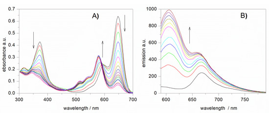 In an oxygen saturated solvent, once the R• radicals escape from the solvent cage (the cage effect), they immediately react with O2 producing peroxyl radicals (Reaction (2), with k2 ~109 M−1·s−1). In our experiment, a sample of 5 mM AIBN in methanol containing 15 μM NB-2 was periodically exposed to 365 nm UV light (5 s), and after 60 s, the absorbance and emission spectra were recorded (separate series of experiments). The obtained UV-vis spectra are presented in Figure 6A, demonstrating that oxidation (H atom abstraction from phenolic moieties, NB-2 → NB-2ox) is accompanied by a ten-fold decrease of the absorbance at λ = 647 nm, a three-fold decrease at 373 nm and a two-fold increase of the absorbance at λmax at 575 nm. Consequently, we decided to use 575 nm as the excitation wavelength for NB-2ox. Figure 6B presents the emission spectra a sample of NB-2 reacting with peroxyl radicals (separate series but the same concentrations and conditions). As the oxidation of NB-2 progresses, an intensive emission for NB-2ox appears with a maximum at λ = 605–615 nm. The intensity of the initial red fluorescence at 674 nm originating from parent molecule (NB-2) increases much slower and overlaps with the aforementioned band at 605–615 nm. Emission intensity measured at 612 nm undergoes a ca. 14-fold enhancement, suggesting that NB-2 is a promising candidate for a fluorescent probe for peroxyl radicals.