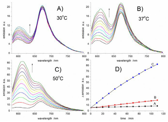 (A–C): Fluorescence spectra recorded for 15 μM NB-2 and 5 mM AIBN in methanol at 30, 37, and 50 °C (upon excitation at λex = 575 nm). (D): Comparison of intensity/time profiles for the emission at 612 nm, read from the same data, as shown in (A–C).