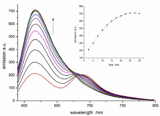 Emission spectra of 10 μM NB-2 dissolved in 8 mM Triton X-100 micelles containing 2.74 mM methyl linoleate and undergoing peroxidation initiated with 10 mM ABAP at 37 °C and pH 7.4. Spectra were recorded every 2.5 min. Inset: Plot of emission intensity at 616 nm versus the time of peroxidation.
