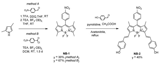 Methods A and B for the synthesis of BODIPY derivative with nitrophenyl at mezo-position (NB-1) and a subsequent attachment of two hydroxycinnamyl residues at positions 3 and 5 leading to derivative NB-2 (TFA = trifluoroacetic acid, DDQ = 2,3-dichloro-5,6-dicyano-1,4-benzoquinone, TEA = triethylamine, THF = tetrahydrofuran).