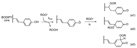 In both kinds of experiments carried out in methanol, with peroxyl radicals generated by photolysis and thermolysis of AIBN, we observed a maximal 14-fold fluorescence enhancement. Such enhancement cannot be assigned to processes other than the reaction with peroxyl radicals (we exclude the reaction with molecular oxygen even during prolonged time, vide supra, and see Figure S6). Therefore, we assume that the oxidized form of NB-2 is responsible for emission at 605–612 nm and 674 nm. Scheme 2 presents a proposed mechanism of a two-step oxidation of one receptor segment of NB-2: H atom abstraction from the phenolic hydroxy group by a peroxyl radical and a subsequent recombination of the formed phenoxyl radical with another peroxyl. This proposed mechanism is in accordance with the standard mechanism of reaction of peroxyl radicals with derivatives of hydroxycinnamic acids, such as p-coumaric, caffeic, ferulic, and sinapic acids [39]. Since recombination of phenoxyl radical with ROO• is very fast (for para-substituted phenols kr > 108 M−1·s−1 [36]), the first reaction, H atom abstraction, with kinh = 103 M−1·s−1 will be the rate determining step. Each hydroxycinnamyl residue can react with two peroxyl radicals, giving n = 4, which is smaller than the experimentally determined n > 5 (Section 3.2). This effect can be explained by the possible addition of the next ROO• to double the C=C bond in structures a2 and a3.