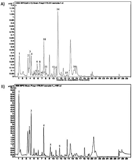 Figure 1 exhibits a HR-LCMS chromatogram regarding A. subhirsutum methanolic extract. The different phytochemical compounds are shown in Table 1 and Table 2. As shown in Figure 1, the most abundant compound is 14, followed by 10, then 1, 3 and 4. Results are comparable to a previous study using LC-DAD-MS [].