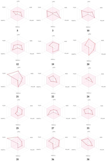 In order to provide the most promising compounds and reduce the risk of drug attrition in the late stage, the ADME parameters of the identified compounds were evaluated using SwissADME software. Herein, we have taken account only of analogs with the most potent ADME properties. As shown (Table 3), by obeying the Lipinski’s rule, the selected compounds manifest good oral absorption with good bioavailability score (0.55–0.56) and TPSA (topological polar surface area) values less than 140 Å2 (except 3), suggesting that they expected to be orally absorbed. Except those of 20 and 40, the rest of the compounds exhibited acceptable consensus Log Po/w. Regarding their pharmacokinetics properties, all selected compounds displayed high gastrointestinal (GI) properties (except 3) and were blood–brain barrier (BBB) permeant (except 23, 33, 36, 40). Some of them were predicted to be not P-gp substrate, giving them the property to have promising intestinal absorption with better bioavailability. The screened CYP (Cytochrome P450) enzyme isoforms (used in biotransformation of drugs and xenobiotics) data indicate that all selected compounds were found to be inhibitors of at least 3 isoenzymes among the tested CYP 1A2, CYP2C19, CYP2C9, CYP2D6 and CYP3A4 isoforms. Their negative skin permeability values allow them to be not permeable through the skin and therefore not suitable candidates for transdermal drug delivery. The drug-likeness behavior was assessed by the bioavailability radar (Figure 2) for oral bioavailability prediction. The results revealed that at least twelve compounds of the extract fall in the pink area of the polygon (Figure 2), suggesting good oral bioavailability.