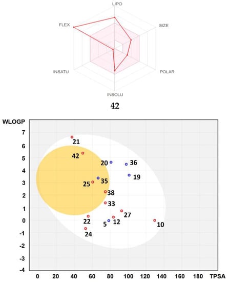 The pharmacokinetic properties were investigated using the boiled-egg model, which allows for estimating of passive gastrointestinal absorption (GIA) and brain penetration (BBB) in function of the position of the molecules in the WLOGP versus TPSA referential (Figure 2). Results demonstrated that compounds possessing high probability to be passively absorbed by the gastrointestinal tract were 5, 10, 12, 18, 19, 20, 21, 22, 24, 25 and 31, with 5, 18, 19 and 31 being predicted to be substrates of the p-glycoprotein (PGP+), however the others were not substrates of the p-glycoprotein (PGP-). Analogs 23, 33, 36 and 40, having the capability of blood–brain barrier penetration, were located in the yolk, with only compound 33 predicted to be a substrate of the p-glycoprotein (PGP+).