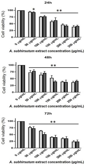 Time course and dose-response effects of Allium subhirsutum methanolic extract at different doses: 0, 50 and 100 µg/mL, on Walker 256/B and MatLyLu cells’ vitality. The cells were incubated for 24, 48 and 72 h. Cell viability was assessed using the MTT assay. Pure (100%) EthO was used as a positive control. Note that the effect is dose- and time-dependent. The most prominent effect was noticed at 72 h with the highest dose (250 µg/mL). Values represent mean ± standard deviation (SD) of n = 3. Statistical difference between the groups * p < 0.05, ** p < 0.01 following one-way analysis of variance (ANOVA) and Newman–Keuls post hoc tests. The experiment was run in triplicate.