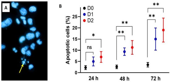 The cytotoxic potential of ASE was apparently associated with reducing cells’ division and enhancing apoptosis. In the current study, apoptotic potential of ASE was assessed, on Walker 256/B cells, by Hoechst 33,342 assay on the basis of DNA fragmentation and therefore, apoptotic bodies. When compared with baseline (D0), a significant statistical increase (p < 0.05) of apoptotic bodies was noted in Walker 256/B treated only with D2 of ASE after 24 h. Both doses D1 and D2 of ASE were found to induce statistically high significant (p < 0.001) increases after 48 h and the effect was more prominent at 72 h (Figure 4). Hence, the apoptotic effect of A. subhirsutum was time- and concentration-dependent. Similarly, previous studies reported that exposure of cancer cells to plant natural products induced apoptotic cell death [,]. Millimouno et al. [] reported that natural compounds could target apoptosis pathways in cancer. Das et al. [] reported that garlic compounds activate cysteine proteases, which enhance apoptosis in human T98G and U87MG cells. Further methods of apoptosis detection, such as caspase activation or annexin double staining, may confirm these results.