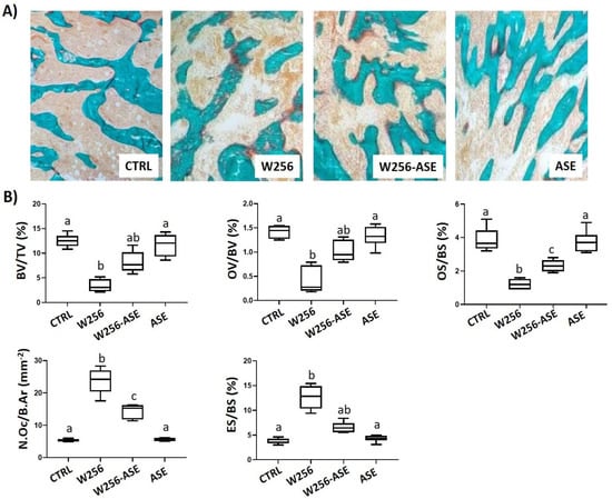 (A) Bone histological sections of the distal operated femurs from CTRL, W256, W256-ASE and ASE groups 20 days after surgery. The sections were stained with Goldner Modified Trichrome. W256/B slide exhibits cancellous and trabecular osteolysis once compared with CTRL and ASE. The inter-trabecular spaces are occupied with both hematopoietic cells together with tumor foci due to Walker 256/B cells’ inoculation. Note the alleviated trabecular network and bone quality in the W256-ASE histological section. Original magnification ×200. (B) Bone histomorphometric data for the distal operated femurs from CTRL, W256, W256-ASE and ASE. BV/TV: trabecular bone volume, OV/BV and OS/BS: osteoid volume and surface respectively, N.Oc/B.Ar: osteoclasts number per bone area, ES/BS: eroded surface. Values represent mean ± SD. Groups with different letters exhibit significant statistical difference at least p < 0.05 following one-way ANOVA and Newman–Keuls post hoc tests.