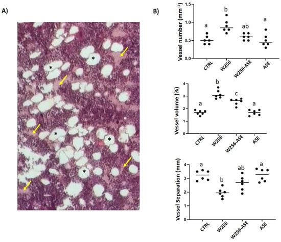 (A) Bone histological section of the distal operated femur from W256 rat 20 days after surgery. The cross-section was realized close to the tumoral foci, just below the growth plate. The section exhibits a high number of blood vessels (arrows) and adipocytes (asterisks) surrounded by a polymorph aspect of hematopoietic lineage and Walker 256/B cells. Original magnification ×200. (B) Angio-architecture of the distal operated femurs from CTRL, W256, W256-ASE and ASE 20 days after surgery. The angioarchitecture was assessed by two-dimensional (2D) histomorphometric analysis. Values represent mean ± SD. Groups with different letters exhibit significant statistical difference at least * p < 0.05 following one-way ANOVA and Newman–Keuls post hoc tests.