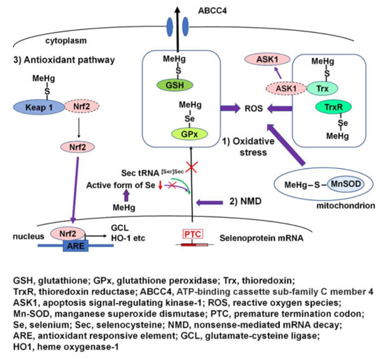 High affinity for selenohydryl groups, sulfhydryl groups, and selenides plays a critical role in the incidence of MeHg-mediated oxidative stress. It causes the impairment of many antioxidant enzymes and proteins, resulting in the disruption of antioxidant systems. On the other hand, MeHg can also activate an antioxidant signaling pathway. Cellular antioxidant transcription factor Nrf2 can be activated through the direct interaction of MeHg and Nrf2 regulator Keap1. Furthermore, MeHg-induced Se deficiency due to the high affinity of MeHg for selenohydryl groups and selenides leads to failure in the recoding of a UGA codon for Sec and results in the degradation of antioxidant selenoenzyme mRNA by NMD. The incidence of MeHg-mediated oxidative stress arises from the interactions of individual intracellular redox systems and the aforementioned MeHg-mediated events. MeHg-mediated oxidative stress causes apoptosis through activation of ASK1 and the subsequent SAPK/JNK pathways. MeHg induces site-specific cerebrocortical neuronal cell death, which was observed in layer IV of the cerebral cortex mainly composed of excitable cells. It has been demonstrated that the mechanism of MeHg-induced site specific cortical neuronal damage is caused by cerebrocortical neuronal hyperactivity triggered by MeHg-mediated oxidative stress and subsequent activation of the p38 MAPK-CREB pathway.