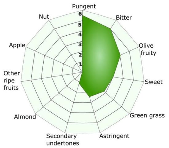 A sensorial analysis was performed by the Catalan Official Olive Oil Tasting Panel according to the UE2568/91 regulations [29]. Briefly, each oil sample was tasted by eight trained tasters in groups of four samples per session (randomly presented within each group). Positive descriptors analyzed were those of the official method (fruity, bitter, pungent), joined with other complementary ones (astringent, sweet, apple, ripe fruits, green, and other secondary undertones). The intensity of each attribute was measured using a continuous scale of 10 cm, anchored at zero and open at 10. The Catalan Panel relies under ISO-17025 certification rules and tasters were previously trained in the identification and intensity measurement of each attribute.