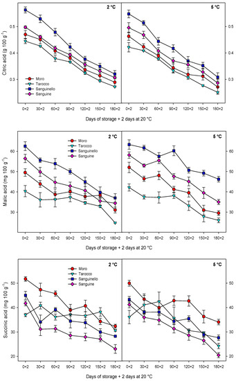 Besides sugars content, organic acids are important components of citrus fruit juice and their concentration depends on the fruit species and cultivars [31,32]. In our study, the main organic acids were citric, malic, succinic, and oxalic acids, of which concentrations were different among blood orange cultivars, although all decreased during cold storage at both temperatures. Citric and malic acids were the main organic acids in blood oranges, respectively, with concentrations being higher in “Sanguinello” and lower in “Tarocco”. The different organic acids content of cultivars, especially citric acid at initial sampling time, could be related to the H+-ATPase pump on the vacuolar membrane, which can provide a large influx of H+ within tonoplast. This proposed mechanism can accumulate additional citric acid in citrus fruit [31]. The reduction in organic acids during cold storage is probably due to their consumption as main substrates for energy production, providing carbon skeletons for the synthesis of phenolic compounds and also synthesis of sugars from organic acids [1]. In addition, the reduction in organic acids could be related to fruit senescence after prolonged storage. In this study, reduction in organic acids at 2 was greater than 5 °C and might be related to alcoholic fermentation at lower temperature [13].