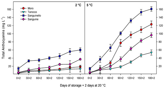 Figure 3 shows total anthocyanin concentration (TAC), while the major individual anthocyanins are shown in Figure S1 by HPLC-UV–visible determination. For all cultivars, a significant increase in TAC was observed during cold storage at both temperatures, the increase being enhanced at 5 °C (65% higher). Among cultivars, “Sanguinello” reached the highest TAC (160.8 ± 5.6 mg L−1), while “Tarocco” showed the lowest (53.6 ± 6.4 mg L−1) at the end of storage at 5 °C. Two major individual anthocyanins were detected by HPLC-DAD for all cultivars: cyanidin 3-glucoside and cyanidin 3-(6″-malonylglucoside), which was found at higher concentration. For both, and similarly to TAC, levels were higher at 5 than at 2 °C and “Sanguinello” reached the maximum contents for both cyanidin 3-glucoside and cyanidin 3-(6″-malonylglucoside), while “Tarocco” had the lowest levels of these anthocyanins.