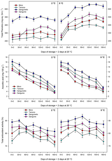 Changes in total phenolics, ascorbic acid, and total antioxidant activity of blood orange cultivars (“Moro”, “Tarocco”, “Sanguinello”, and “Sanguine”) stored at 2 and 5 °C for 180 days plus 2 days at 20 °C. Vertical bars represent ± standard error (SE) of means. LSD (p < 0.05) values are 31.55, 0.44, and 4.29, for total phenolics, ascorbic acid, and total antioxidant activity, respectively.