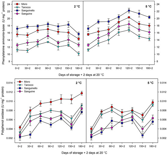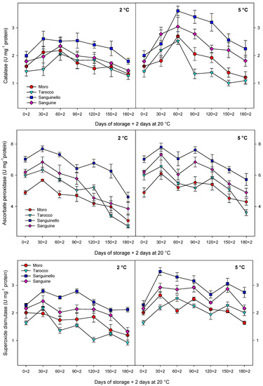 The activities of the antioxidant enzymes increased up to 30 or 60 days and then, decreased towards the end of storage at both temperatures, this reduction being greater at 2 than 5 °C. Among cultivars, “Sanguinello” had the highest level of antioxidant enzyme activities at both temperatures, while “Moro” and “Tarocco” showed lower antioxidant enzyme activities at both storage conditions.