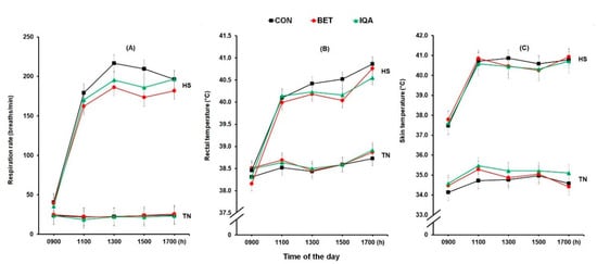 Rectal temperature was increased by HS (38.6 vs. 39.9 °C, p < 0.001) and by time of the day (38.4a, 39.3b, 39.4b, 39.4b, and 39.8c °C at 900, 1100, 1300, 1500, and 1700 h, respectively; p < 0.001; Figure 1B). However, there was an interaction between environmental condition and time (p < 0.001) such that the RT of pigs exposed to HS increased to a greater extent in comparison with those subjected to TN condition (Figure 1B). Although there was no main effect of dietary treatment on RT, there was an interaction between HS and diet (p = 0.001) such that RT were lower in pigs fed pigs fed BET or IQA and exposed to HS but not in the pigs kept in TN condition (Figure 1B).