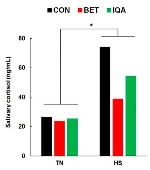 Figure 2. Effect of thermoneutral (TN) and heat stress (HS) conditions on salivary cortisol concentrations of growing pigs fed a control diet (CON), the control plus betaine (BET), or the control plus isoquinoline alkaloids (IQA). Each bar represents the pooled effect of saliva collected on days 1 and 2 of the heat challenge. Due to sample heterogeneity, the results were transformed (log10) before analysis, then presented as mean of back-transformed means. HS significantly increased salivary cortisol (* p = 0.010). No effects of diet or interactions with temperature were observed. n = 8–9 pigs per group, with values representing adjusted means ± pooled SED for the interaction between T × D.