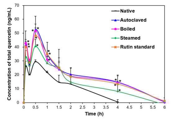 Plasma concentration-time curves of total quercetin after a single-dose oral administration of native, rutin-enriched TB flour extracts (TBFEs), and standard rutin in rats (n = 6). Asterisk (*) indicates significant differences from native TBFE at each time point (p < 0.05).
