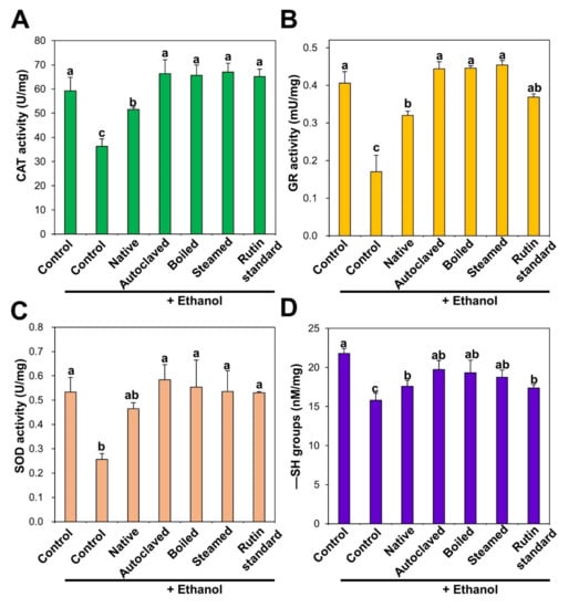 (A) catalase (CAT), (B) glutathione reductase (GR), (C) superoxide dismutase (SOD) activities, and (D) −SH groups level in the liver after 28-day repeated oral administration of native, rutin-enriched TBFEs, and standard rutin, 5 h prior to ethanol administration. Different lowercase letters (a, b and c) indicate significant differences among native, rutin-enriched (autoclaved, boiled, and steamed) TBFEs, and standard rutin (p < 0.05).