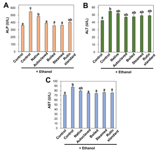 (A) alkaline phosphatase (ALP) (B) alanine aminotransferase (ALT) and (C) aspartate transaminase (AST) in serum after 28-day repeated oral administration of native, rutin-enriched TBFEs, and standard rutin, 5 h prior to ethanol administration. Different lowercase letters (a, b and c) indicate significant differences among native, rutin-enriched (autoclaved, boiled, and steamed) TBFEs, and standard rutin (p < 0.05).