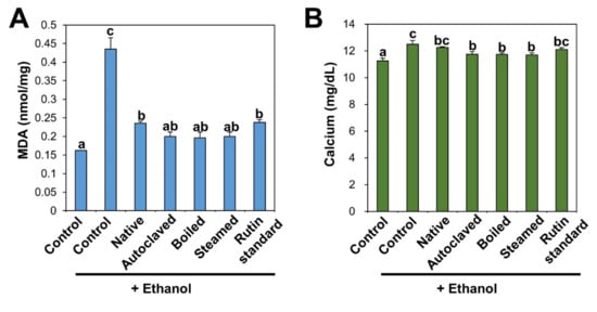 (A) MDA and (B) calcium in serum after 28-day repeated oral administration of native, rutin-enriched TBFEs, and standard rutin, 5 h prior to ethanol administration. Different lowercase letters (a, b and c) indicate significant differences among native, rutin-enriched (autoclaved, boiled, and steamed) TBFEs, and standard rutin (p < 0.05).