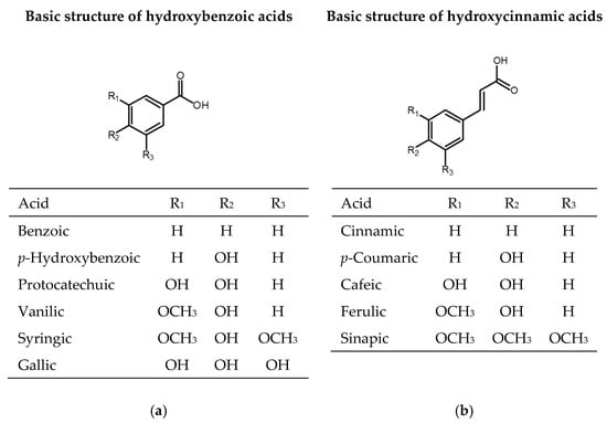 Chemical structures of phenolic acids: (a) derivates of hydroxybenzoic acid; (b) derivates of hydroxycinnamic acid.