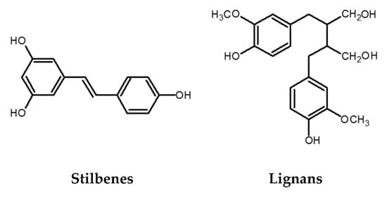 Lignans are phenolic dimers possessing a 2,3-dibenzylbutane structure (C6-C3-C3-C6 structure) (Figure 3). They participate in the formation of the building blocks for the formation of lignin, which is responsible for the structural rigidity of the plant cell wall. Seeds (linseeds, flaxseeds), followed by nuts, grains, vegetables, tea, coffee, and wine are a rich source of lignans. They have anticancer, antioxidant, antihypertensive, antiviral, estrogenic, and insecticidal properties [].