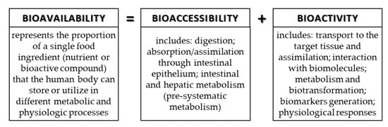 The food contains many components (nutrients and bioactive compounds) that can be absorbed during digestion, but to be available for absorption/assimilation, these components, or their fractions, first have to be released from the food matrix [,]. The release of components and/or their fractions to make them available for absorption during digestion in the GIT is the definition of bioaccessibility. Bioaccessibility is the first step to make an ingredient bioavailable. In addition to bioaccessibility, bioavailability includes the usage of the ingredients and its bioactivity, which includes the outcome that the absorbed component has (Figure 4). More precisely, bioavailability includes GI digestion, absorption, bloodstream, and tissue distribution, and, finally, bioactivity [,].