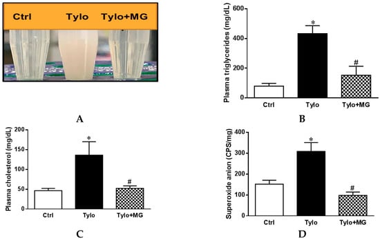 Effects of magnolol (MG) treatment on plasma lipid profiles and hepatic superoxide anion in tyloxapol (Tylo)-injected rats. (A) Plasma levels of triglyceride (TG); (B) macroscopic photograph of plasma; (C) plasma levels of cholesterol (TC); (D) superoxide anion formation. Data are expressed as mean ± SEM, n = 5–12. * p < 0.05 vs. Ctrl; # p < 0.05 vs. Tylo (tyloxapol).