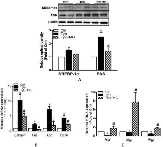 Lipid accumulation in hepatocytes is the primary stage of the progression of hepatic steatosis. Sterol regulatory element-binding protein-1c (SREBP-1c) is the major transcription factor in the regulation of lipogenic de novo biosynthesis by activating acetyl-CoA carboxylase (ACC) and fatty acid synthase (FAS) in the liver [30]. To examine the role of MG in the regulation of lipid homeostasis, we evaluated protein and gene expression involving lipogenesis and lipolysis. As shown in Figure 2A, protein expression of SREBP-1c and FAS were significantly upregulated by Tylo injection, while MG administration exhibited lower levels of SREBP-1c and FAS protein expression (p < 0.05). In addition, the mRNA levels of Srebp-1, Fas, Acc, and Cd36 were significantly elevated in the liver of Tylo-injected rats, which were all diminished by treatment with MG (p < 0.05) (Figure 2B). Figure 2C shows that significant induction of lipolysis genes Hsl, Mgl, and Atgl was observed after MG treatment (Figure 2C). These results suggested MG preserved hepatic lipid homeostasis by modulating lipogenesis and lipolysis.