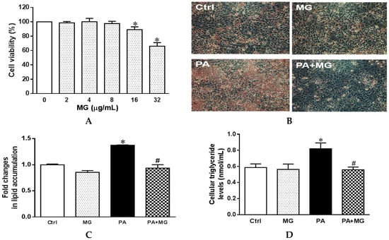 Lipotoxicity is generally induced by incubation with saturated fatty acids in vitro, such as palmitic acid (16:0), the most abundant saturated fatty acid in the diet and circulation [36]. To evaluate the cell viability of MG, HepG2 cells were treated with progressive doses of MG (0, 2, 4, 8, 16, and 32 µg/mL) for 24 h. The effect on MG on cell viability was assessed by MTT assay. The results showed that no significant toxicity was observed at MG concentrations up to 8 µg/mL (Figure 4A). Therefore, an amount of 8 µg/mL of MG was employed for further analysis.