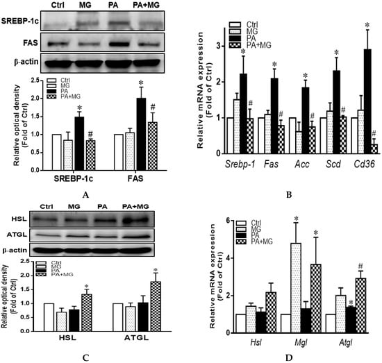 Protein expression of SREBP-1c and FAS as well as mRNA levels of Srebp-1, Fas, Acc, Scd, and Cd36 were significantly increased in the presence of PA (p < 0.05) (Figure 5A,B). MG treatment drastically reversed these increases (Figure 5A,B). Furthermore, protein expression of lipolysis markers HSL and ATGL as well as mRNA levels of Hsl, Mgl, and Atgl were notably increased by MG treatment (Figure 5C,D). These results suggested that MG preserved lipid homeostasis with decreased lipogenesis and enhanced lipolysis in PA-induced steatotic HepG2 cells.