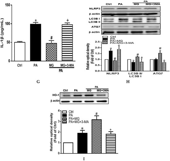 As expected, 3-MA treatment increased ROS formation (Figure 7F), IL-1β levels (Figure 7G), and NLRP3 protein expression as well as diminished the MG-induced increase of LC3B and ATG 7 (Figure 7H). In particular, the combined administration of 3-MA attenuated MG-mediated HO-1 expression (Figure 7I). Collectively, these results suggested that MG reduced intracellular lipid deposition by modulating various genes/proteins involved in lipid homeostasis via activation of autophagy to induce HO-1, thereby protecting against hyperlipidemia and NAFLD.