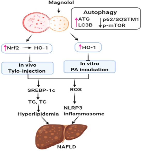 Schematic depiction of the protective mechanisms of magnolol (MG) in tyloxapol- and palmitic acid-induced NAFLD. MG activates autophagy by upregulation of ATG5-12, ATG7, Beclin1, and LC3B and reduction of p62/SQSTM1 and p-mTOR expression, which results in the activation of antioxidant Nrf2/HO-1 signaling, thereby suppressing tyloxapol and palmitic acid (PA)-induced hepatic steatosis and inflammation. In addition, MG inhibits hyperlipidemia through downregulation of SREBP-1c, as well as ROS and NLRP3 inflammasome activation.