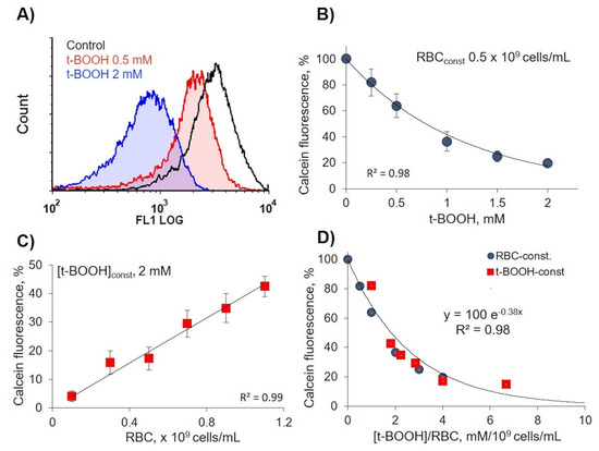 Calcein fluorescence intensity strongly depended on oxidant to cell count ratio. Red blood cell (RBC) suspension was incubated with tert-Butyl hydroperoxide (t-BOOH) at indicated concentrations for 1 h, then RBCs were stained with calcein-AM (5 µM, 40 min) and analyzed for calcein fluorescence intensity by flow cytometry at FL1 (logarithmic scale). (A) Representative histograms from five independent experiments. (B) Dependence of calcein fluorescence intensity in constant RBC count from t-BOOH concentrations. (C) Dependence of calcein fluorescence intensity in constant t-BOOH concentration from RBC count. (D) Exponential dependency between calcein fluorescence intensity and the ratio of oxidant concentration/cell count ([t-BOOH]/RBC). Data in (B,C) are presented as means ± SD, n = 5.