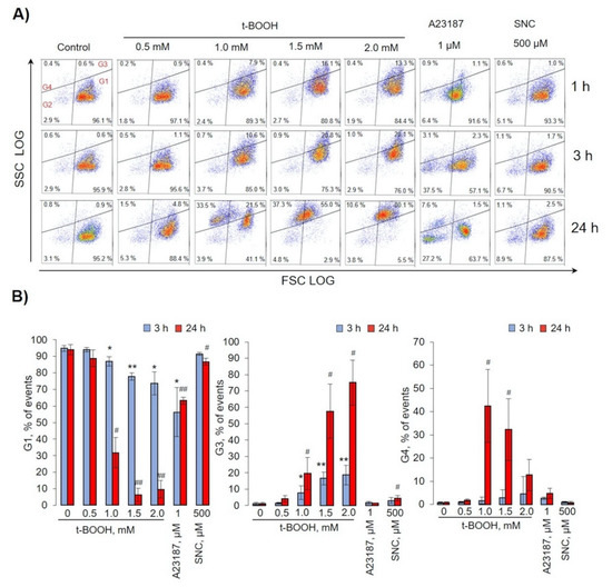 Oxidative stress induced by t-BOOH-triggered RBC transformations and microvesicle formation. RBCs (0.5 × 109 cells/mL) were incubated at indicated concentrations of t-BOOH, A23187, and S-nitroso-L-cysteine (SNC) at the indicated times. Gate 1 represents control RBCs, gate 2—microparticles (MPs), gate 3—transformed RBCs, and gate 4—microvesicles (MVs). (A) Representative dot plots out of six independent experiments. (B) Quantification of presented data expressed as mean ± SD, n = 6. One-way ANOVA, Tamhane T2 (G1, G2 24 h, G4), or Tukey HSD post hoc (G2 3 h) were used where appropriate. * p < 0.05, ** p < 0.001 compared to control (t-BOOH 0mM, 3 h); # p < 0.05, ## p < 0.001 compared to control (t-BOOH 0mM, 24 h).