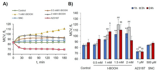 Effects of t-BOOH, A23187, and SNC on RBC volume changes. RBCs (0.5 × 109 cells/mL) were incubated with indicated concentration of t-BOOH, A23187, and SNC for indicated times and were analyzed by hematological analyzer. (A) Representative histogram of mean cell volume (MCV) changes for one donor for 3 h; symbols indicate time of analysis. (B) Quantitative data from 10 independent experiments (10 donors). Data are presented as mean ± SD (n = 10), one-way ANOVA, Levene’s test < 0.05, and Tamhane T2 post hoc. ** p < 0.001 compared to 1h control; ##, p < 0.001 compared to 3 h control; $, p < 0.05, $$, p < 0.001 compared to 24 h control.