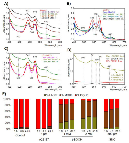 First, we tested the effects of used compounds on free Hb (Figure 4A,B), and then intact cells were oxidized and lysed in hypoosmotic conditions, and corresponding spectra were scanned (Figure 4C). t-BOOH firstly oxidized Hb to MetHb, followed by oxidation to HbChr (Figure 4A). To evaluate the effects of NO donor (SNC), we used hypoxic conditions by application of N2. SNC first formed HbNO and then was oxidized to MetHb without significant formation of HbChr (Figure 4B,C,E and Table 1). MPs and MVs were collected from RBCs after 24 h of the application of indicated compounds and then supernatants and MV- and MP-containing pellets were scanned spectrophotometrically (Figure 4D). t-BOOH-induced MVs contained ferryl forms of Hb, whereas SNC- and A23187-produced MPs did not contain any significant amount of Hb. The percentage of Hb species was calculated according to [25] and is presented in Figure 4E and Table 1. These data indicated that only t-BOOH-induced oxidative stress resulted in HbChr formation, SNC led only to metHb formation, and increase of intracellular calcium concentration had no effects on Hb oxidation.
