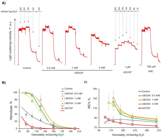 RBCs (0.5 × 109 cells/mL) were incubated at indicated concentrations of A23187, SNC, and t-BOOH at indicated times. Then, aliquots (10 µL) of each sample were resuspended in 1 mL of HEPES buffer for osmotic fragility test. Hemolysis curves were registered for a range of osmolality from 210 to 70 mOsm/kg H2O. For each osmolality step, we added corresponding volume of water and RBCs to the sample to keep RBC concentration constant. The cell volume investigation algorithm was used for the estimation of cell volume changes dynamics and percentage of hemolysis [26,27,28,29]. The following parameters were calculated from hemolysis curves: H50, an osmotic fragility variable that represents the saline concentration that induces 50% lysis; W, the distribution width; and MCV120, maximal mean cell volume during the OFT, which is calculated from the hemolysis curve based on MCV300. MCV300, mean cell volume, was controlled by a hematological analyzer. The basic principles of the OFT are described in Figure S1.
