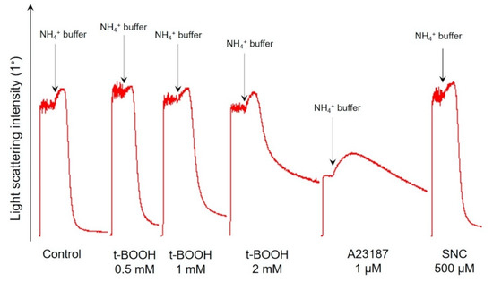 Oxidative stress was induced by tert-Butyl hydroperoxide, t-BOOH (0.25, 0.5, 1, 1.5, 2 mM). Calcium stress, as increased intracellular Ca2+ concentration, was inducted by calcium ionophore A23187 (1 µM) in HEPES buffer with 2 mM calcium. Nitrosative stress was inducted by S-nitroso-L-cysteine, SNC (500 µM). To evaluate whether t-BOOH effects on RBCs are reversible or not, we incubated RBCs with 1 or 2 mM of t-BOOH for 0.5 h; the cells were divided into two groups, one of which was washed 2 times by HEPES buffer with EGTA (“washed”), and the other left without washing out t-BOOH (“no washing”).