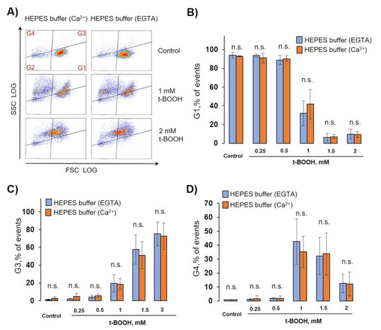 OS-induced RBC transformation and MV formation were calcium-independent. RBCs (0.5 × 109 cells/mL) were incubated with the indicated concentration of t-BOOH in HEPES buffer containing 2 mM calcium, or 2 mM EGTA, for indicated times and were analyzed by flow cytometry. (A) Representative SSC/FSC dot plots of one out of six independent experiments for 24 h. Template and gating correspond to Section 3.2. (B–D) Calculation of events distributed in the corresponding gates. Data are presented as mean ± SD (n = 7), paired t-test; n.s., not significant.
