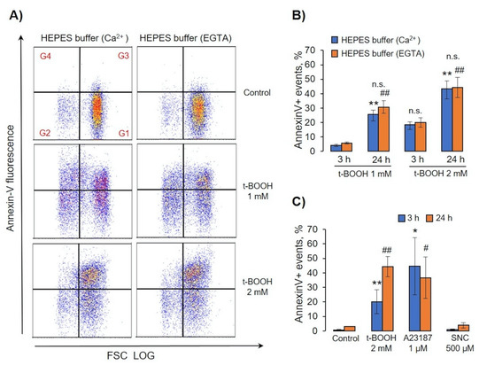 For MV formation analysis, we used the same template as in Section 3.2 and calculated events in gates G1, G3, and G4 in HEPES-buffer containing calcium (2 mM) or EGTA (2 mM). Surprisingly, calcium had no significant effect on OS-induced RBC transformations and MV formation (Figure 7A–D). Next, we tested whether PS surface exposure (annexin-V binding) as a marker of eryptosis is dependent on extracellular calcium. Similar to MV formation, calcium had no significant effect on OS-induced annexin V binding (Figure 8A,B). We compared percentage of annexin V-positive cells after A23187, t-BOOH, and SNC treatment (Figure 8C). A23187 and t-BOOH after 3 h significantly increased PS exposure, whereas SNC had no significant effect.