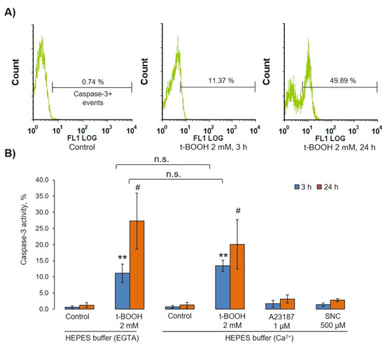 t-BOOH-induced OS activated caspase 3 in RBCs. RBCs (0.5 × 109 cells/mL) were incubated with indicated concentrations of t-BOOH, A23187, and SNC in HEPES buffer containing 2 mM calcium or 2 mM EGTA for indicated times. After we incubated them with indicated compounds, cells were fixed by 1% (final concentration) of methanol-free formaldehyde, permeabilized by 0.5% Tween for 20 min, and then anti-active caspase-3 antibodies were added for 30 min, with caspase-3 activation being measured by flow cytometry according to the manufacturer’s instructions. (A) Original histograms from one of seven independent experiments. (B) Data quantification based on seven independent experiments. Data are presented as the mean ± SD (n = 7), one-way ANOVA (HEPES buffer with EGTA both 3 h and 24 h), Tukey HSD post hoc (HEPES buffer with Ca2+ 3 h), Tamhane T2 post hoc (HEPES buffer with Ca2+ 24 h); paired t-test HEPES buffer (EGTA) and HEPES buffer (Ca2+), ** p < 0.001 compared to corresponding control, # p < 0.05 compared to corresponding control, n.s.— not significant.