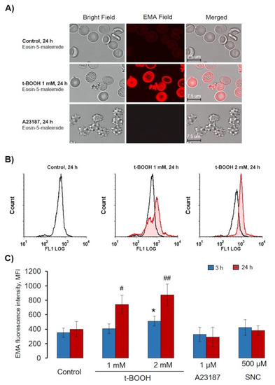 t-BOOH-induced oxidative stress led to band 3 clustering and MV formation. RBCs (0.5 × 109 cells/mL) were incubated as indicated with t-BOOH, A23187, and SNC at the indicated times, followed by EMA staining (0.07 mM, 40 min). (A) Representative confocal images of t-BOOH transformed RBCs. RBCs were processed for confocal microscopic analysis as described in the Materials and Methods section (Section 2.2.7). (B) Original histograms of EMA fluorescence intensity after 24 h t-BOOH treatment. (C) Quantification of flow cytometry data. Data are presented as mean ± SD (n = 7), one-way ANOVA, Levene’s test > 0.05, Tukey HSD post hoc (3 h) was used, * p < 0.05, compared to 3 h control; Levene’s test < 0.05, Tamhane T2 post hoc (24 h) was used, # p < 0.05, ## p < 0.001 compared to 24 h control.