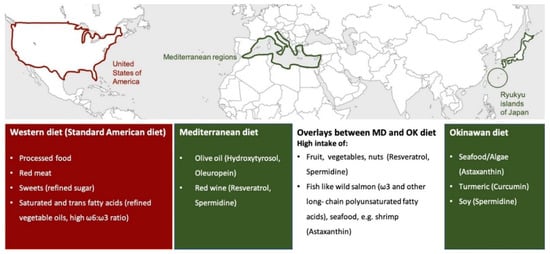 Characteristic bioactive compounds of the Mediterranean and Asian/Okinawan diet. The figure shows the geographic origin of three different types of diets: the Western, the Mediterranean, and the Asian (Okinawan) diet. The Mediterranean diet is defined as a dietary pattern of people living in countries that border the Mediterranean Sea, whereas the Okinawan diet originates from the eating habits of the indigenous people of the Japanese Ryukyu Islands (main island Okinawa). The Western diet is prevalent in developed countries, especially in the USA. Typical of the Mediterranean diet is the consumption of red wine with its active ingredients resveratrol and spermidine, and the intake of olive oil with its active ingredients oleuropein and hydroxytyrosol. All four compounds are associated with beneficial effects on human health. Characteristic food items of the Okinawan diet that are also known for their health benefits are soy products such as tofu (spermidine), turmeric (curcumin), seafood, and algae (astaxanthin). Similarities of both diets include the intake of a broad spectrum of antioxidants, polyphenols (like resveratrol), and spermidine from fruit and vegetable and the moderate-to-high consumption of seafood and fish (astaxanthin, healthy fatty acids). In contrast to both diets, the Western diet could have detrimental health consequences due to the high consumption of unhealthy fatty acids (saturated fatty acids), red meat, sweets, and highly processed food items. Abbreviations: MD = Mediterranean diet, OK = Okinawan diet, ω = omega, USA = United States of America.