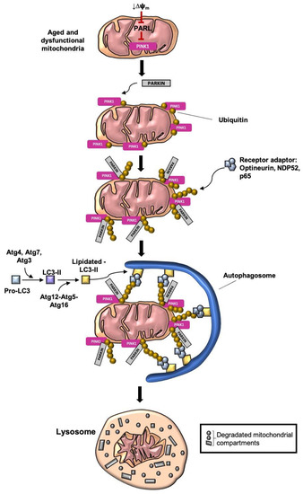- Ubiquitin-mediated mitophagy is induced by a massive ubiquitination of mitochondrial OMM proteins [45]. One of the prominent members of ubiquitin-mediated mitophagy is the PINK1–PARKIN pathway. The PINK1–PARKIN pathway is the best-known pathway in the correlation of mitophagy and neurodegeneration (Figure 3) [87,88].