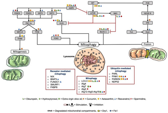Target points of the dietary compounds on mitochondrial dynamics and mitogenesis, with a particular focus on mitophagy. AMPK is one of the central upstream regulators of mitophagy and mitogenesis. Through oxidative-stress, induced mtDNA mutation activates the AMPK pathway and further inhibits the mTOR [46]. AMPK, in turn, stimulates mitophagy via ULK1 and mitogenesis via the PGC-1 α pathway. The main upstream mediators of PGC-1 α are FOXO1/3 and SIRT1/3. PGC-1 α, in turn, activates mitophagy via NRF1/2 and TFAM. Paradoxically, the mitogenesis promoter PGC-1 α also interferes with mitophagy by regulating lysosomal biogenesis via TFEB. Further, AMPK targets FOXO1 and -3. FOXO, in turn, increases the transcription of essential mitophagy mediators and proteins. On the other hand, mTOR blocks mitophagy by inhibiting ULK1 as well as downstream signaling of ribosomal protein S6K1, which, in turn, also suppresses mitophagy by indirectly inhibiting ULK1 and Beclin-1. The upstream modulator of mTOR is the IR/IGF-R, which activates PI3K, followed by activation of AKT, which activates mTOR. ERK, in turn, phosphorylates Drp1 for mitochondrial fragmentation and stimulates mitophagy due to the activation of IR/IGF-R signals. In general, Fis1 is recruiting Drp1 to the OMM to induce mitochondrial fission. In this figure, the target points of the most prominent compounds of both the Mediterranean and the Asian/Okinawan diets are displayed. Hydroxytyrosol and oleuropein from olive oil, curcumin, astaxanthin, resveratrol, and spermidine were all found to stimulate mitochondrial dynamics, mitogenesis, and, especially, mitophagy. Abbreviation: AMPK = AMP-activated protein kinase; mtDNA = mitochondrial DNA; mTOR = mammalian target of rapamycin; ULK1 = unc-51-like kinase 1; PGC-1 α = peroxisome proliferator-activated receptor gamma coactivator 1-alpha; FOXO1/3 = forkhead transcription factor 1/3; SIRT1/3 = silent mating type information regulation 2 homolog 1/3; NRF1/2 = nuclear respiratory factor 1 and 2; TFAM = mitochondrial transcription factor A; TFEB = transcription factor EB; S6K1 = S6 kinase beta-1; IR/IGF-R = insulin receptor/insulin-like growth factor receptor; PI3K = phosphoinositide 3-kinase; AKT = protein kinase B; ERK = extracellular signal-regulated kinase; Drp1 = dynamin-related protein 1; Fis1 = fission protein 1; OMM = outer mitochondrial membrane.