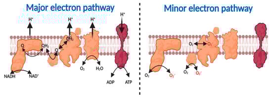 The major fate of substrate-derived electrons—free radicals—tunneling (a quantum mechanical property that enables electrons to penetrate a potential energy barrier without further input energy), according to the principles of quantum mechanics, through the redox centers nestled within the mitochondrial respiratory complexes is to reduce O2—a diradical—to H2O (reaction 1, see Figure 1) [,,,,,]. The free energy associated with the thermodynamically favorable electron transfer from NADH (Eo’ = −340 mV) or FADH (Eo’ = +31 mV) via ubiquinol (Eo’ = +45 mV) to O2 (Eo’ = +840 mV) is used by complex I, III and IV to pump protons, to create an electrochemical proton motive force (Δp), comprising a membrane potential (ΔΨm~−150–200 mV) and pH component (ΔpH = ~0.8), across the inner mitochondrial membrane [,,,]. Δp enables OXPHOS by forcing the F1-Fo ATP synthase (i.e., complex V) to synthesize, as opposed to hydrolyze, ATP (reaction 2) [,,]. A minor fate of substrate-derived electrons in the respiratory chain is to support the univalent reduction of O2 to superoxide at complex I, II and III (reaction 3, see Box 1 and Figure 1) [].